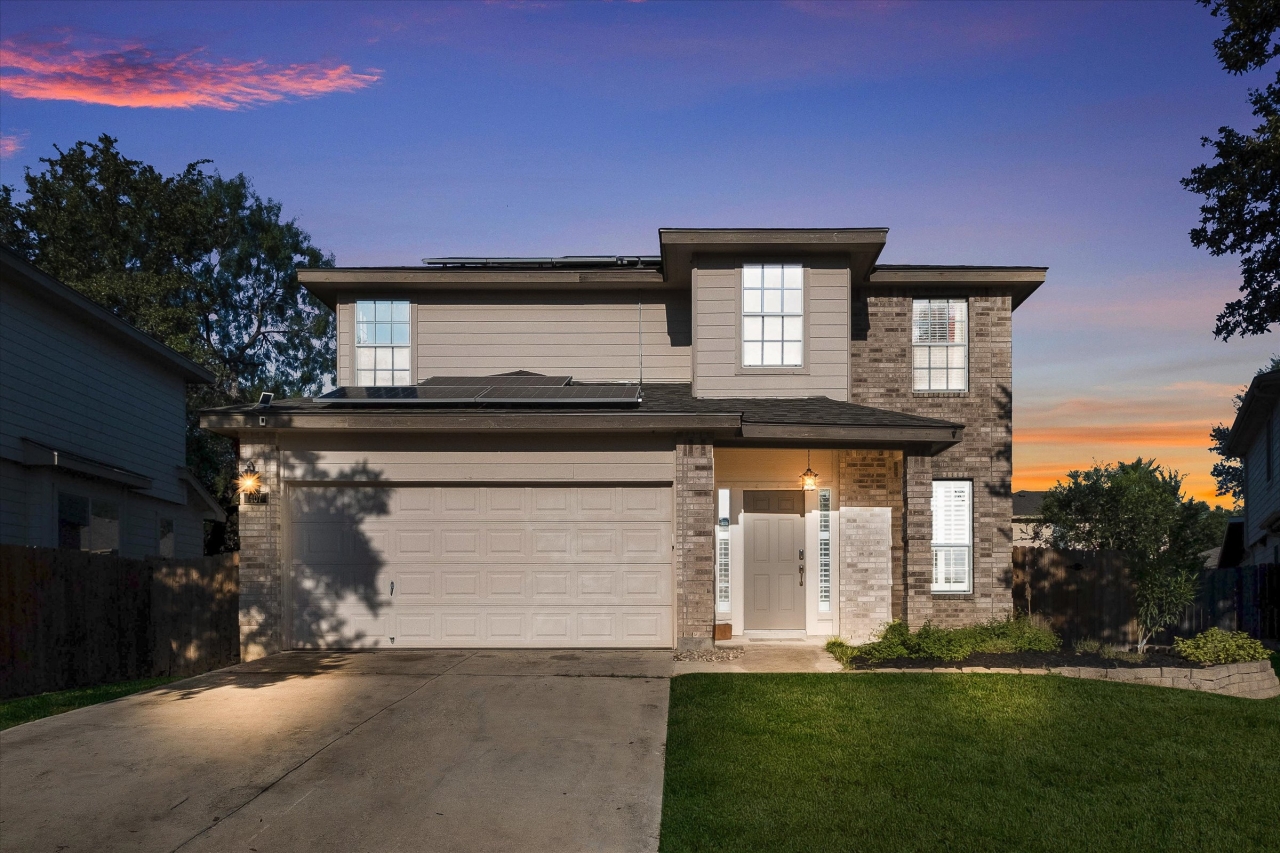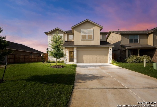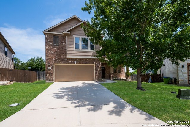 Welcome to this inviting 3-bedroom, 2.5-bathroom two-story home located in the Sundance Ridge neighborhood, nestled in a cul-de-sac lot. The kitchen features brilliant white cabinetry, a glass tile backsplash with dark complementary counters, built-in appliances, and a cooktop, making it both functional and stylish. The open living and dining areas are filled with natural light, creating a warm and welcoming atmosphere for family gatherings and entertaining. The primary bedroom, located upstairs, offers a double vanity, a tile shower, and a garden tub, providing a relaxing retreat. The family room is thoughtfully designed and leads to generously sized secondary bedrooms, along with a full bathroom, offering ample space for family or guests. Step outside to enjoy the oversized covered patio in the large private backyard-perfect for relaxation or entertaining. This home is ideally located just minutes from local HEB, dining, and shopping, with convenient access to Loop 1604 and Hwy 90.